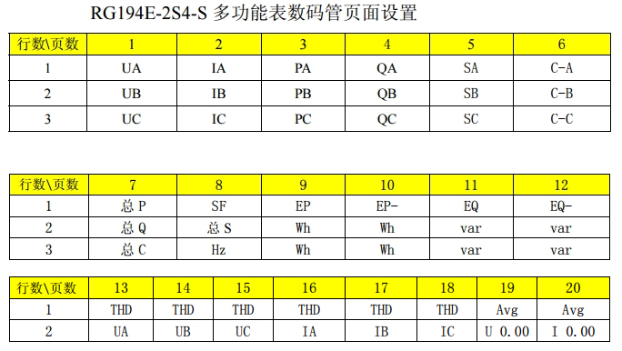Uab、Ubc、Uca(线电压);Ia、Ib、Ic(电流);Pa、Pb、Pc、P∑(每相有功功率和总功率)、Qa、Qb、Qc、Q∑(每相无功功率